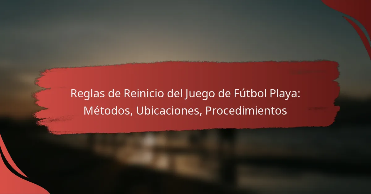 Los partidos de fútbol playa pueden reiniciarse utilizando varios métodos, incluidos los saques de banda, los saques de meta, los tiros libres, los córners y los penaltis. Cada método tiene reglas y procedimientos específicos que los jugadores deben seguir, asegurando un juego limpio y un flujo continuo del partido. Además, los reinicios se llevan a cabo en zonas designadas del campo, que son esenciales para mantener la claridad y el orden durante los partidos.